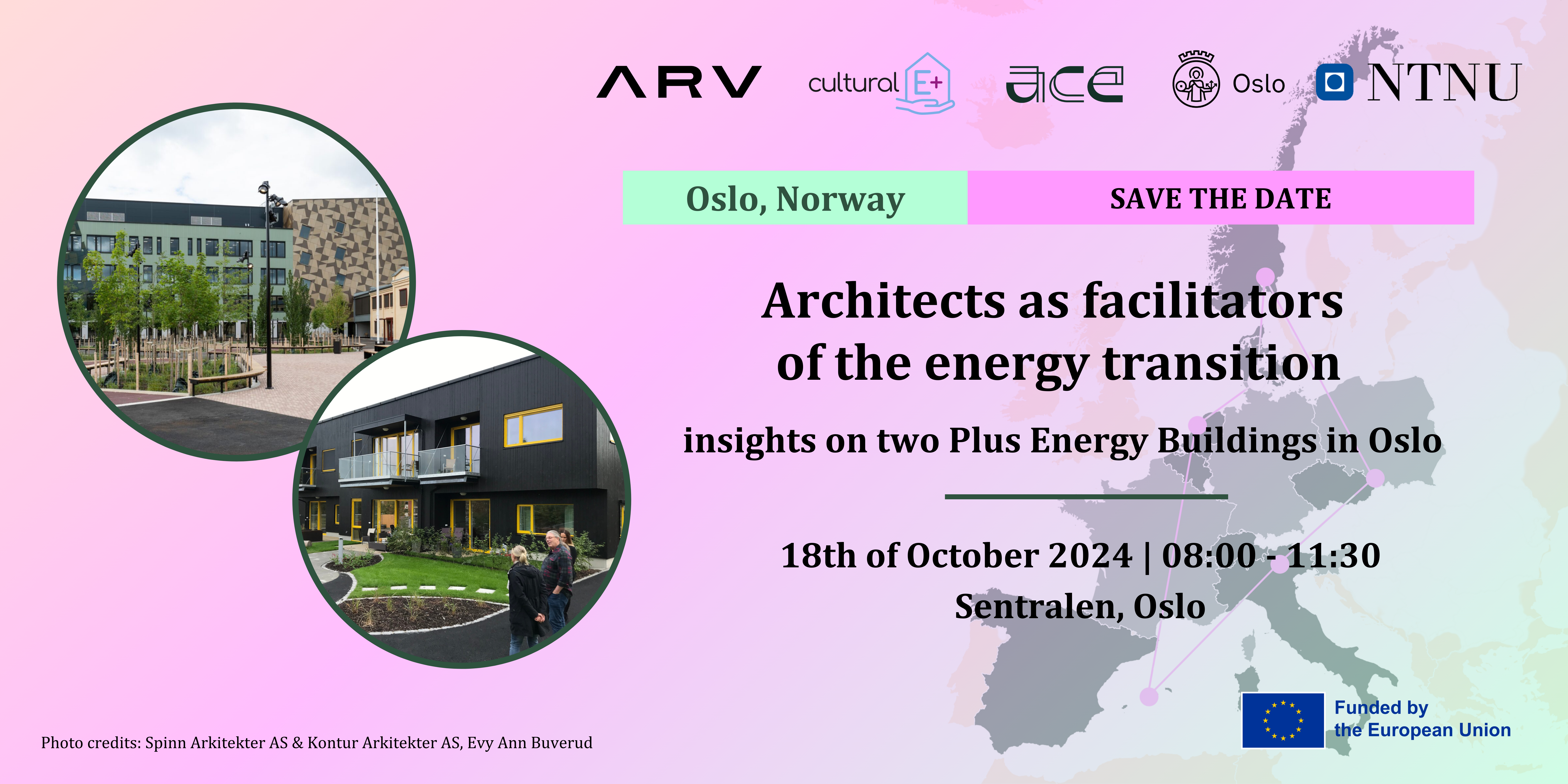 Join our awareness-raising event in Oslo to discover a wide range of replicable solutions for designing Plus Energy Buildings. Our keynote speakers will be the architects Erik Brett Jacobsen (KONTUR Arkitekter), Miriam Sivertsen (SPINN Arkitekter), and Marit Reisegg Myklestad (Østengen & Bergo AS) for the ARV project, and Evy Ann Buverud (SØR arkitekter AS) for the Cultural-E project.
