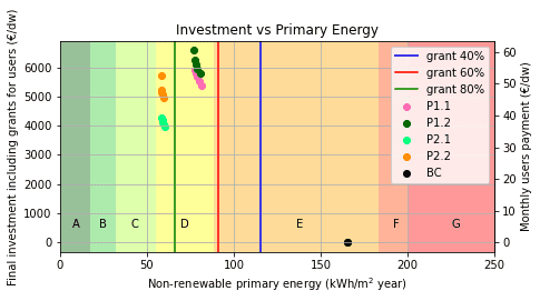A two-step methodology that aims to select the cost-optimal solutions for retrofitting of buildings in large-scale renovation process (200-300 dwellings). From a set of different potential combinations of passive elements (e.g., adding different insulation materials with different thickness and/or windows) and active elements (e.g., heat pumps / multi-split air conditioning for heating, cooling and DHW and/or photovoltaics), the methodology helps to select the most appropriate combination considering the energy performance and economic parameters. The process aims to select solutions that achieve a 50% reduction in the energy demand and/or a significant improvement in the thermal comfort conditions. A detailed economic model is part of the methodology giving as a result the following outputs: investment costs deducting grants for each owner and life cycle global costs.