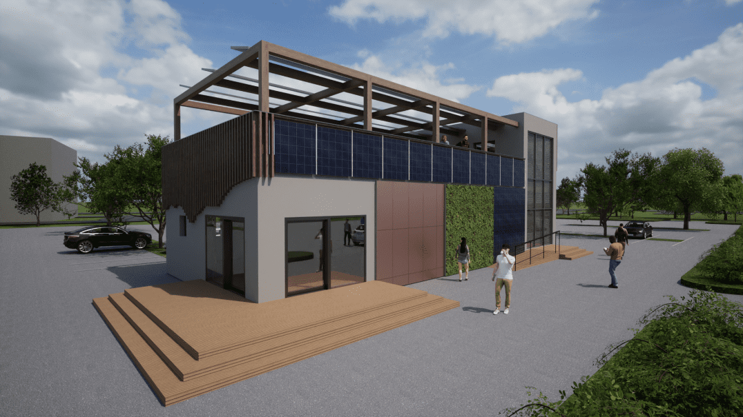 The first scenario is the construction of a new wooden-based positive energy building located in in an area currently used as a parking lot. The new building has been conceived as a multifunctional hub with integrated services.